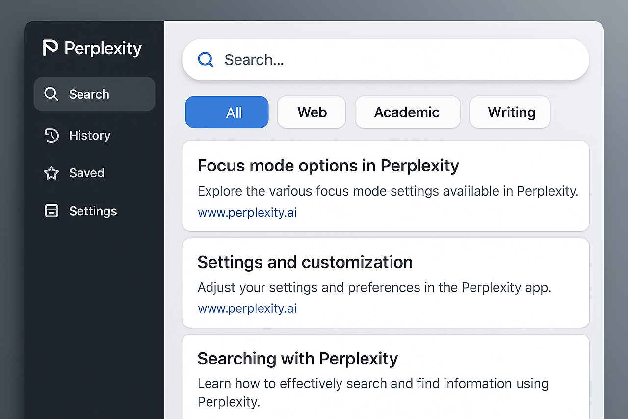 Focus 모드는 검색 범위를 특정 출처로 제한하여 더 정확한 정보를 찾을 수 있는 핵심 기능입니다. 검색창 아래의 "Focus" 버튼을 클릭하면 다음 옵션들을 선택할 수 있습니다